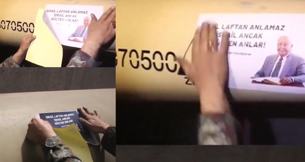 Videoda, saldırı için hazırlanan füzelerin üzerine Mavi Marmara şehitlerine atıfta bulunan notlar ve Türkiye’nin eski Başbakanlarından Necmettin Erbakan’ın mesajlarının eklendiği görüldü.
