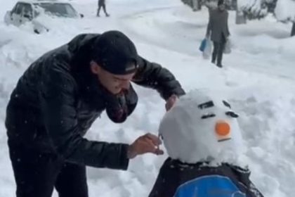 Şırnak’ta etkili olan kar yağışının ardından iş yerinin önünde kardan adam yapan erkek kuaförü Halil Atak, kardan adama peştamal bağlayarak tıraş uygulaması gerçekleştirdi. Kuaför makas ve tarakla kar...